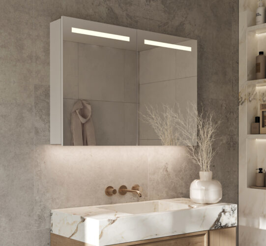 Indirecte verlichting aan de onderzijde van de spiegelkast. Dit type verlichting zorgt voor een sfeervol lichtschijnsel over de wand