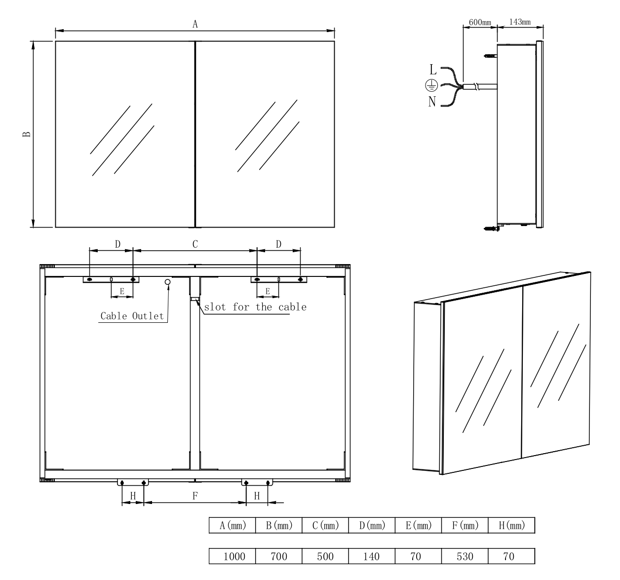 Deze spiegelkast is 100 cm breed, 70 cm hoog en 14 cm diep.