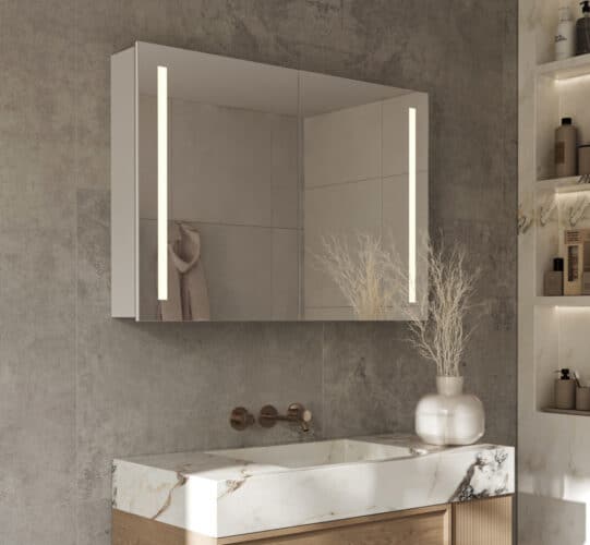 Naast de verlichting is ook de handige spiegelverwarming volledig in de 2 deuren geïntegreerd. Dankzij de spiegelverwarming ontstaat er geen condens na bv het douchen, ideaal! De verlichting en verwarming worden in- en uitgeschakeld middels een handbeweging langs de sensor die aan de onderzijde van de spiegelkast is gemonteerd.