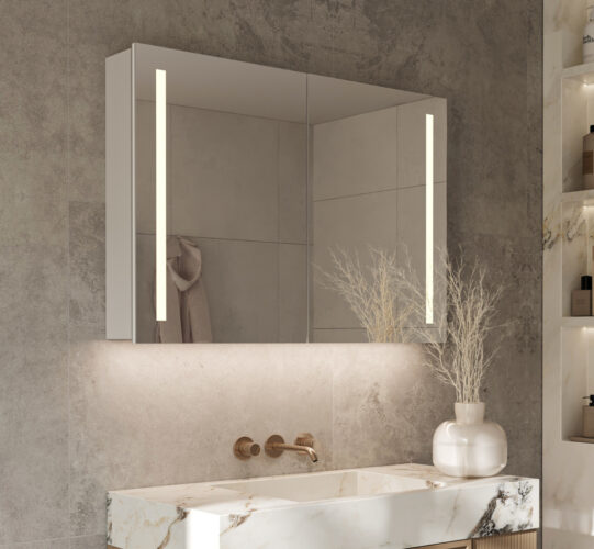 Naast de verlichting is ook de handige spiegelverwarming volledig in de 2 deuren geïntegreerd. Dankzij de spiegelverwarming ontstaat er geen condens na bv het douchen, ideaal! De verlichting en verwarming worden in- en uitgeschakeld middels een handbeweging langs de sensor die aan de onderzijde van de spiegelkast is gemonteerd.