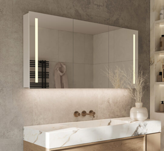 Indirecte verlichting aan de onderzijde van de spiegelkast. Dit type verlichting zorgt voor een sfeervol lichtschijnsel over de wand