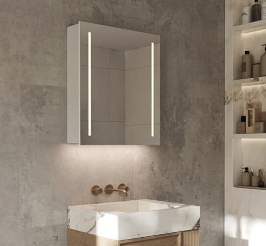 De geïntegreerde spiegelverwarming voorkomt dat de spiegel beslaat na bv het douchen, handig!