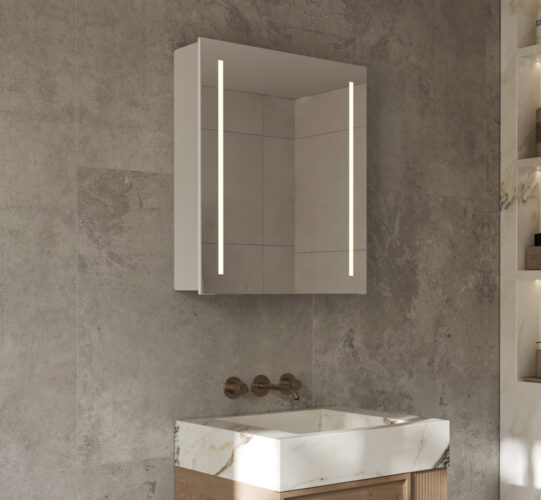Stijlvolle en praktische aluminium badkamer spiegelkast van 60 cm breed en 70 cm hoog. De verticale lichtbalken zorgen voor een prima verlichting in het gezicht tijdens bv het scheren of make-uppen. Lees verder...