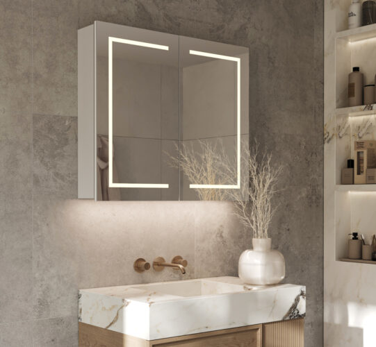 Naast de verlichting is ook de handige spiegelverwarming volledig in de 2 deuren geïntegreerd. Dankzij de spiegelverwarming ontstaat er geen condens na bv het douchen, ideaal! De verlichting en verwarming worden in- en uitgeschakeld middels een handbeweging langs de sensor die aan de onderzijde van de spiegelkast is gemonteerd.
