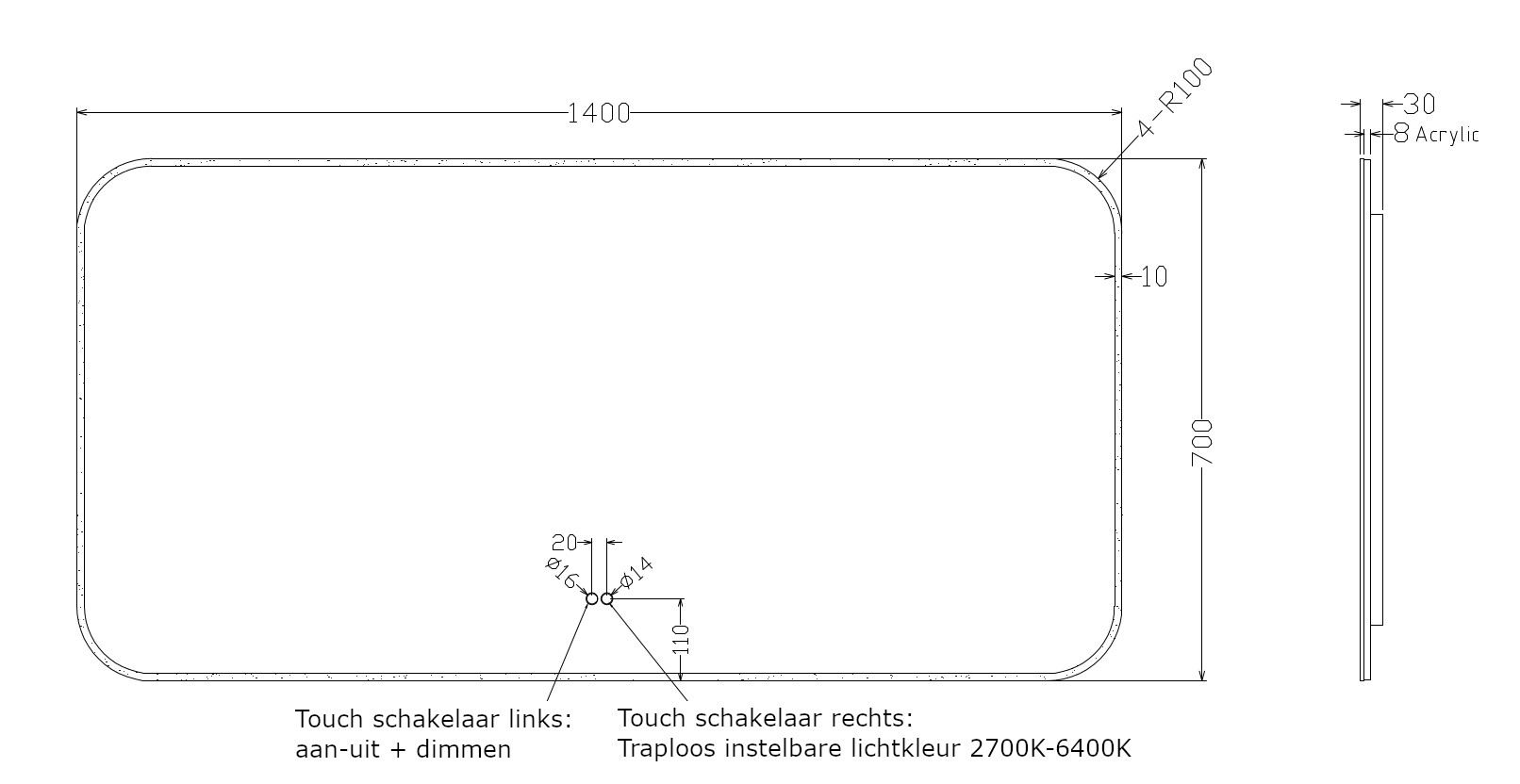 Dubbele touch schakelaar met dimfunctie en instelbare LED kleur Zowel de verlichting als de verwarming wordt bediend met de linker touch schakelaar aan de voorzijde van de spiegel. Door de touch knop ingedrukt te houden wordt de verlichting traploos gedimd. Zo stel je zelf de juiste lichtsterkte in.