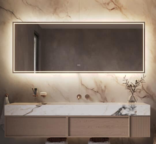 Stijlvolle brede design spiegel welke van alle gemakken is voorzien: dimbare verlichting, spiegelverwarming en instelbare lichtkleur