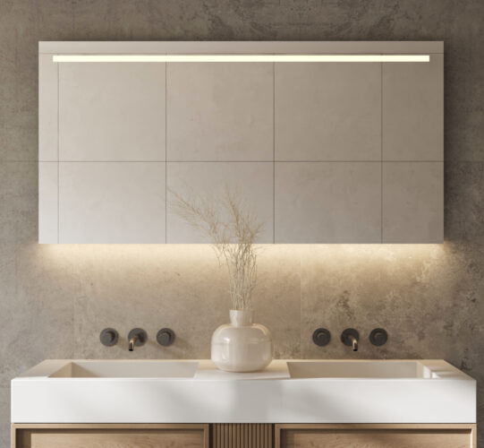 Deze 140×70 cm badkamer spiegel is aan de bovenzijde voorzien van een 2,5 cm brede lichtbalk voor praktische verlichting in het gezicht. De ambient verlichting aan de onderzijde schijnt fraai over de wand en zorgt voor veel sfeer in de badkamer. Lees verder...
