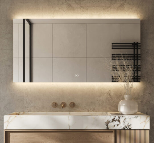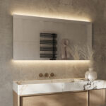 Indirecte verlichting aan de achterzijde van de spiegel. Dit type verlichting zorgt voor een sfeervol lichtschijnsel over de wand