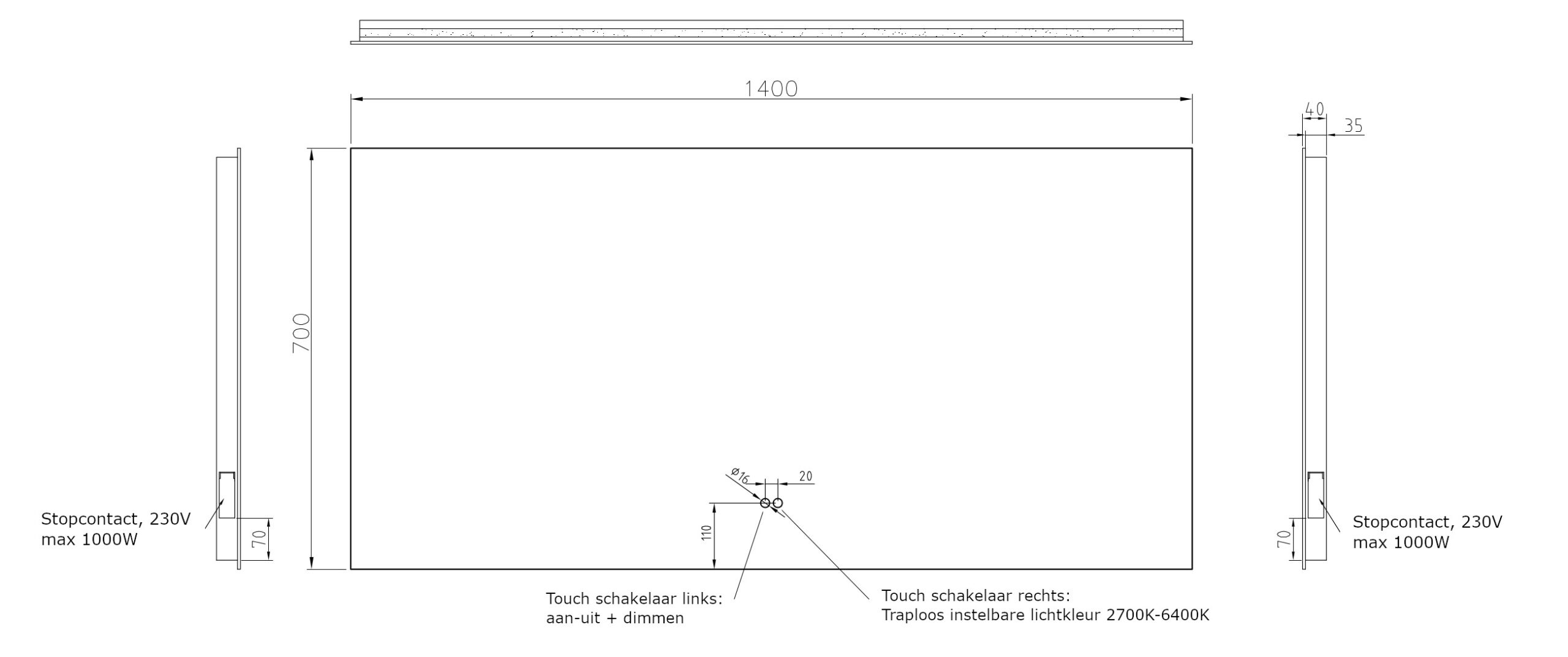 Dubbele touch schakelaar met dimfunctie en instelbare LED kleur Zowel de verlichting als de verwarming wordt bediend met de linker touch schakelaar aan de voorzijde van de spiegel. Door de touch knop ingedrukt te houden wordt de verlichting traploos gedimd. Zo stel je zelf de juiste lichtsterkte in.