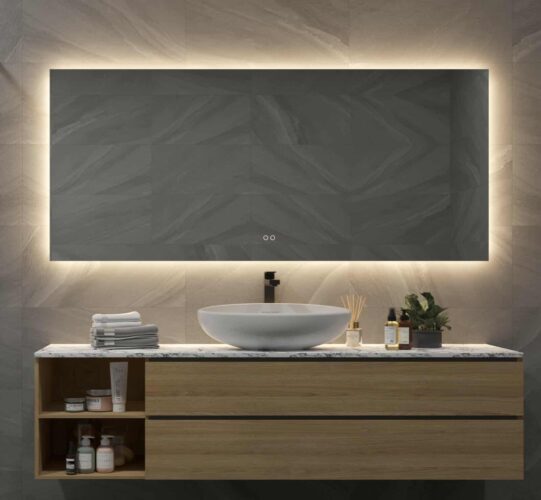 Indirecte verlichting aan de achterzijde van de spiegel. Dit type verlichting zorgt voor een sfeervol lichtschijnsel over de wand