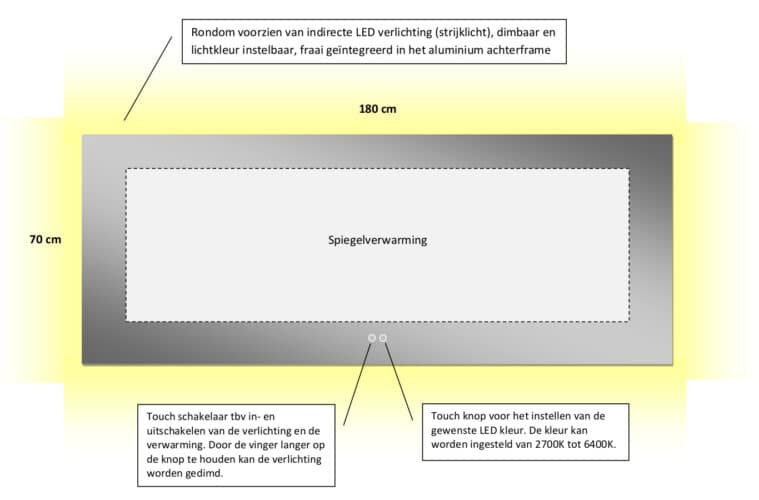 LED verlichting De LED verlichting is bij deze spiegel rondom geplaatst en fraai weggewerkt in het aluminium achterframe. De dimbare verlichting schijnt vanachter de spiegel sfeervol over de wand.