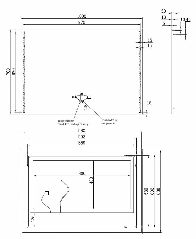 Dubbele touch schakelaar met dimfunctie en instelbare LED kleur Zowel de verlichting als de verwarming wordt bediend met de linker touch schakelaar aan de voorzijde van de spiegel. Door de touch knop ingedrukt te houden wordt de verlichting traploos gedimd. Zo stelt u zelf de juiste lichtsterkte in.