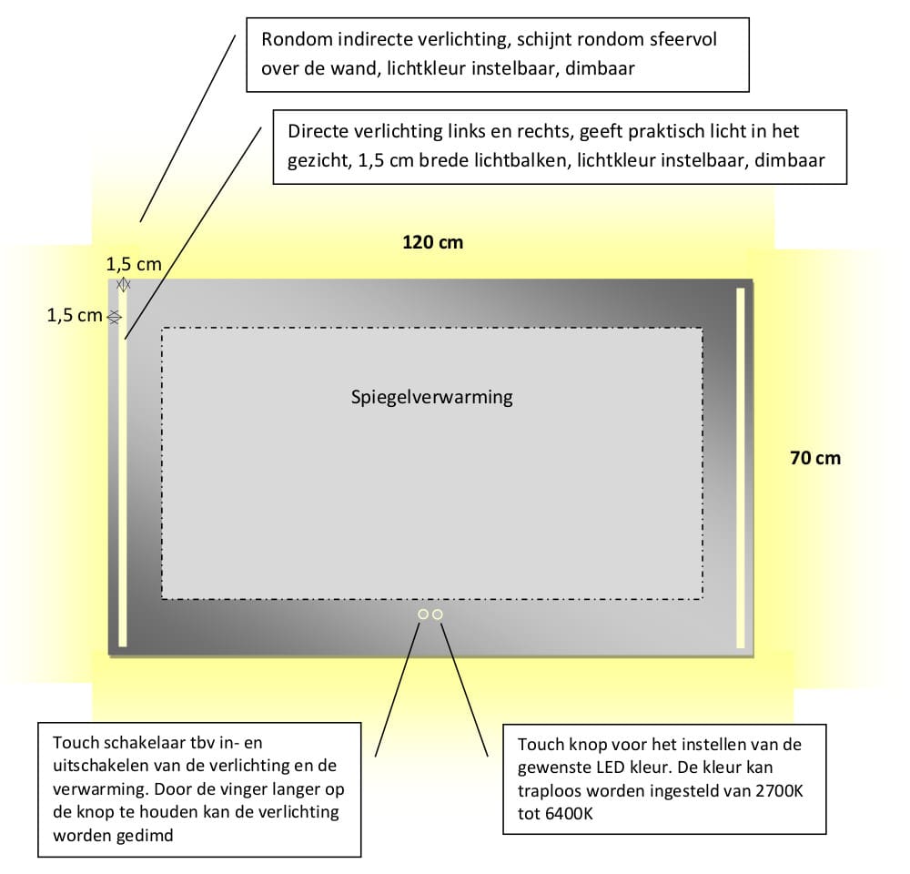 Dubbele touch schakelaar met dimfunctie en instelbare LED kleur Zowel de verlichting als de verwarming wordt bediend met de linker touch schakelaar aan de voorzijde van de spiegel. Door de touch knop ingedrukt te houden wordt de verlichting traploos gedimd. Zo stelt u zelf de juiste lichtsterkte in.