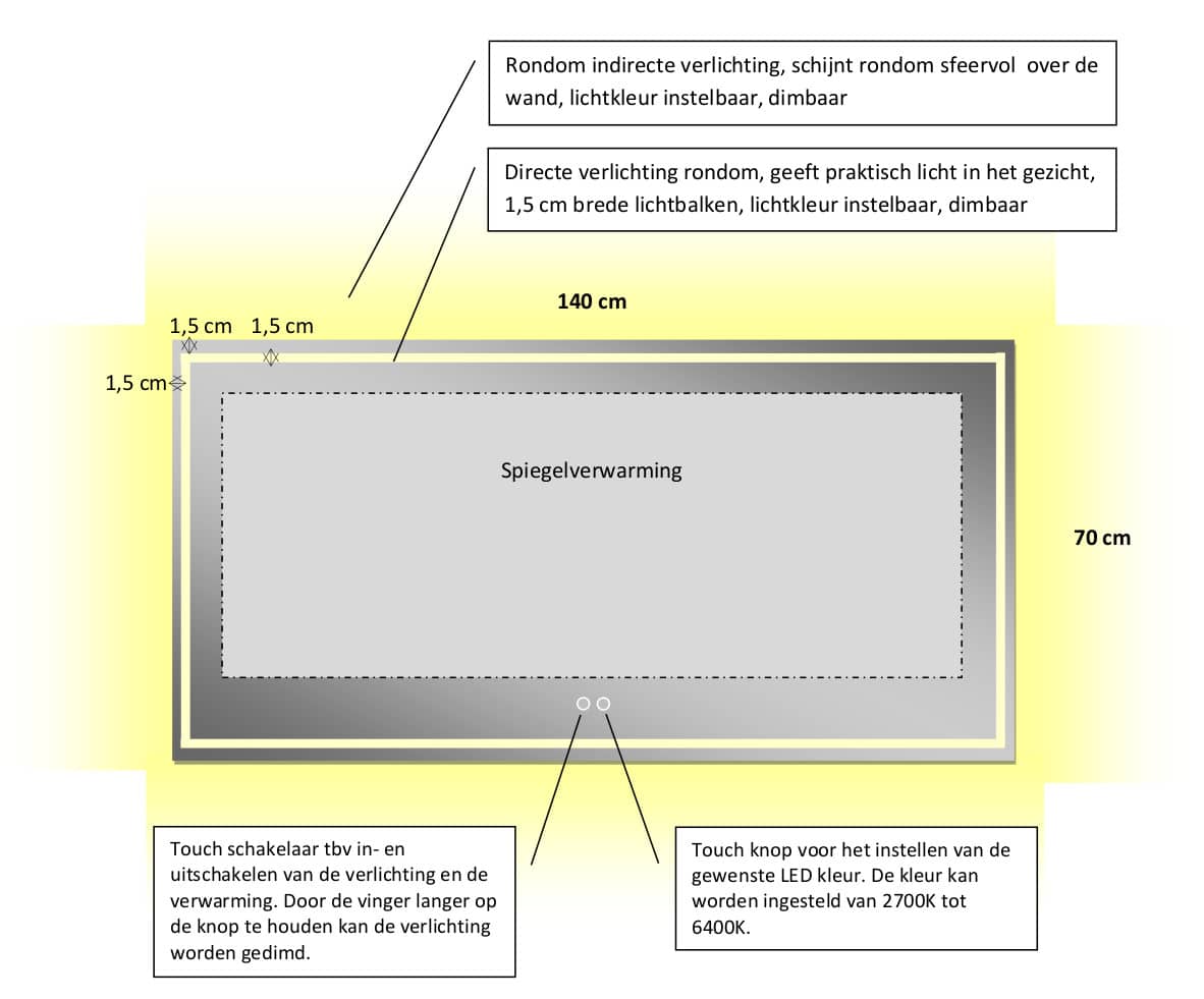 Deze stijlvolle badkamer spiegel is 140 cm breed, 70 cm hoog en slechts 3 cm diep. De spiegel is van alle gemakken voorzien, zoals: rondom directe en indirecte verlichting, spiegelverwarming en een dubbele touch schakelaar waarmee zowel de lichtkleur als lichtsterkte kan worden ingesteld. Lees verder...