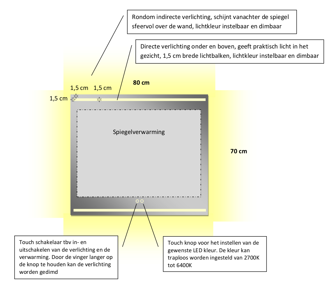 Dubbele touch schakelaar met dimfunctie en instelbare LED kleur Zowel de verlichting als de verwarming wordt bediend met de linker touch schakelaar aan de voorzijde van de spiegel. Door de touch knop ingedrukt te houden wordt de verlichting traploos gedimd. Zo stelt u zelf de juiste lichtsterkte in.