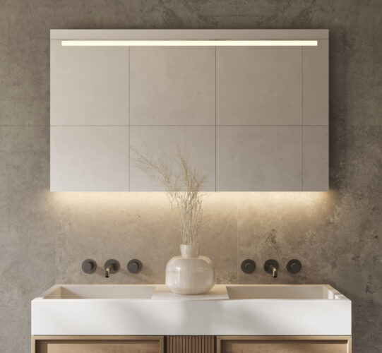 Deze 120×70 cm badkamer spiegel is aan de bovenzijde voorzien van een 2,5 cm brede lichtbalk voor praktische verlichting in het gezicht. De ambient verlichting aan de onderzijde schijnt fraai over de wand en zorgt voor veel sfeer in de badkamer. Lees verder...