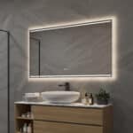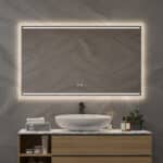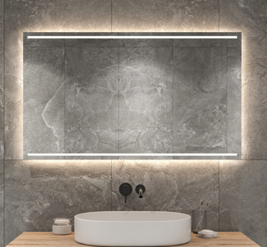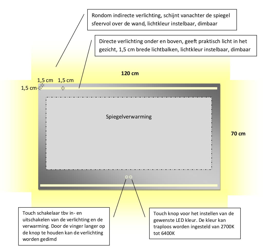 Fraaie badkamerspiegel met verlichting, spiegelverwarming en dubbele touch knop voor oa het instellen van de lichtkleur en het activeren van de dimfunctie