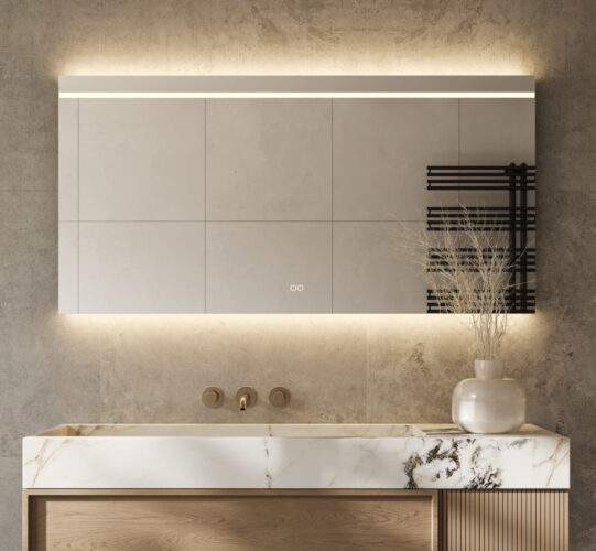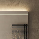 Indirecte verlichting aan de achterzijde van de spiegel. Dit type verlichting zorgt voor een sfeervol lichtschijnsel over de wand