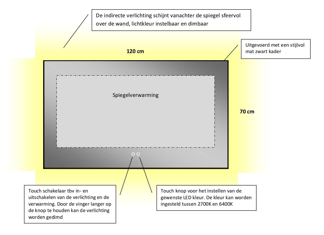 Deze badkamerspiegel met mat zwart frame is 120 cm breed, 70 cm hoog en voorzien van rondom indirecte verlichting en spiegelverwarming. De dimbare verlichting schijnt vanachter de spiegel rondom en sfeervol over de wand. Lees verder...
