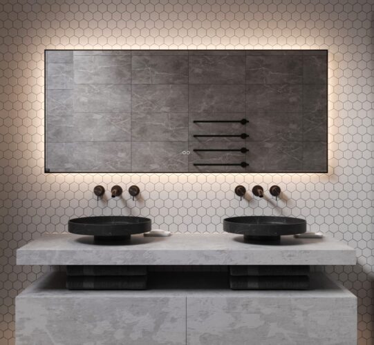 Luxe badkamerspiegel met zwarte omlijsting uitgevoerd met dimbare verlichting en spiegelverwarming
