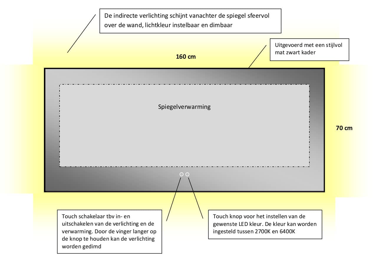 Deze badkamerspiegel met mat zwart frame is 160 cm breed, 70 cm hoog en voorzien van rondom indirecte verlichting en spiegelverwarming. De dimbare verlichting schijnt vanachter de spiegel rondom en sfeervol over de wand. Lees verder...