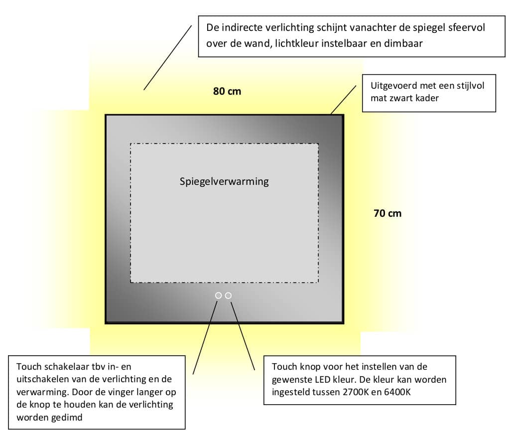 Deze luxe, mat zwarte spiegel is 80 cm breed, 70 cm hoog en voorzien van rondom indirecte verlichting en spiegelverwarming. De dimbare verlichting schijnt vanachter de spiegel rondom en sfeervol over de wand. Lees verder...