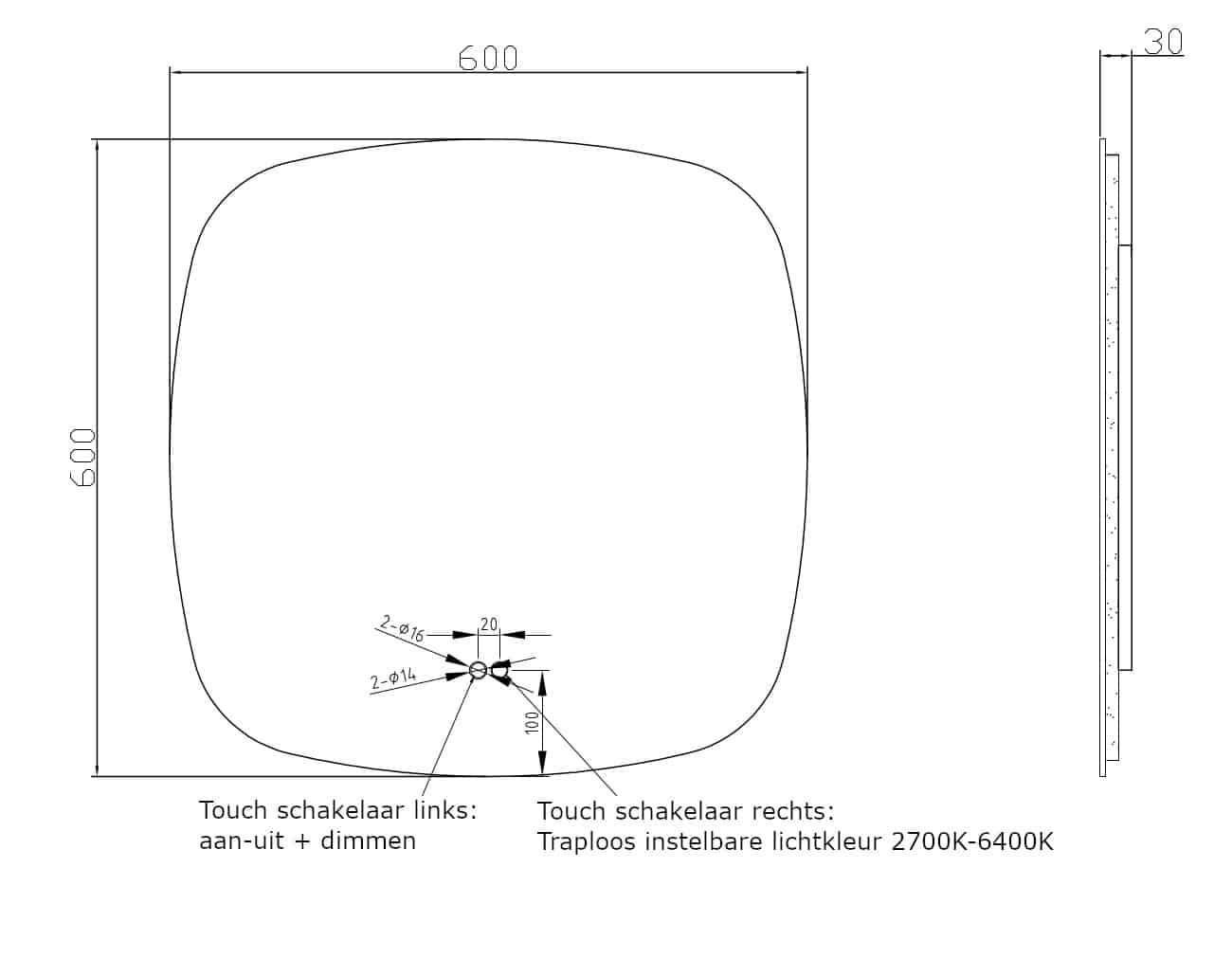 Zowel de verlichting als de verwarming worden bediend met de linker touch schakelaar aan de voorzijde van de spiegel. Door de touch knop ingedrukt te houden wordt de verlichting traploos gedimd. Zo stel je zelf de juiste lichtsterkte in.