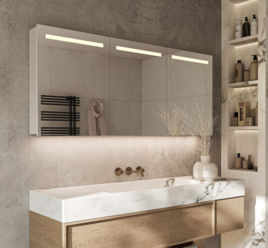 Daarnaast zorgt de geïntegreerde verwarming ervoor dat de spiegeldeuren niet beslaan na bv het douchen, handig! De verlichting en verwarming worden in- en uitgeschakeld middels een handbeweging langs de sensor die aan de onderzijde van de spiegelkast is gemonteerd.