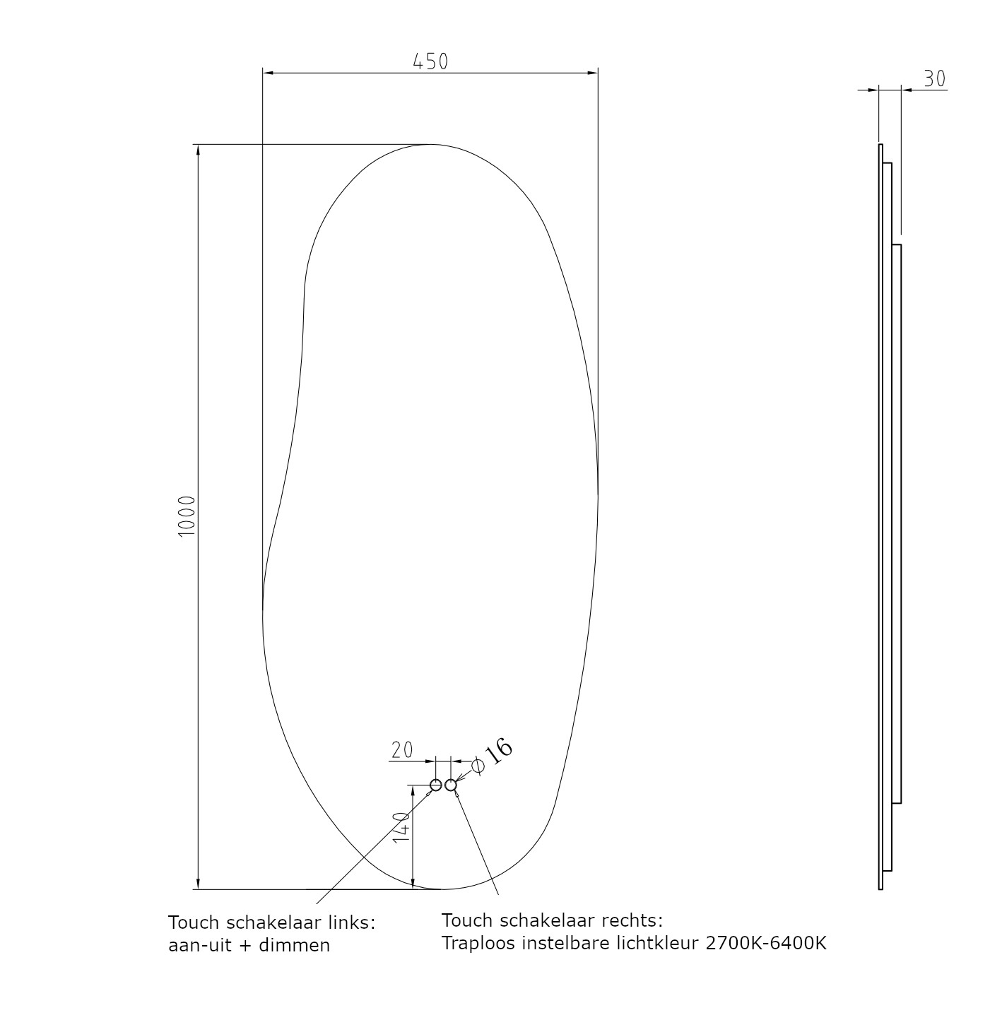 Deze unieke organische badkamer spiegel is 45 cm breed, 100 cm hoog, slechts 3 cm diep en is van alle gemakken voorzien, zoals verlichting, spiegelverwarming en een praktische, dubbele touch schakelaar om de verlichting mee te dimmen en de gewenste lichtkleur mee in te stellen, handig! Lees verder...