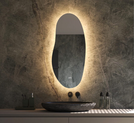 LED verlichting De hi-power LED verlichting is bij deze organische spiegel rondom geplaatst en schijnt vanachter de spiegel sfeervol over de wand.