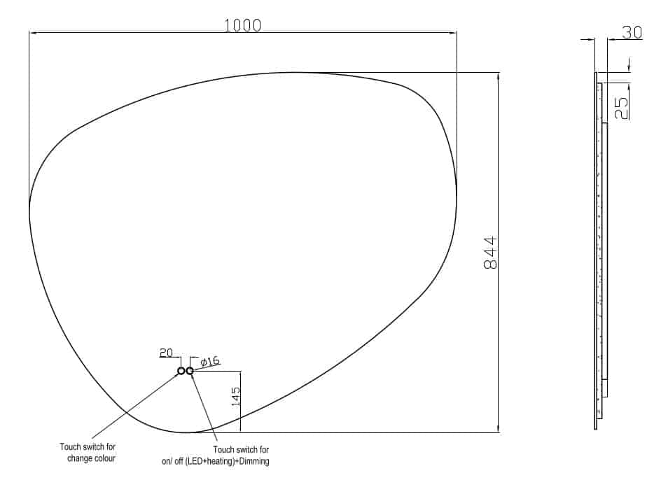Stijlvolle organische badkamer spiegel van 100 cm breed, uitgevoerd met dimbare verlichting, instelbare lichtkleur, spiegelverwarming en dubbele touch schakelaar