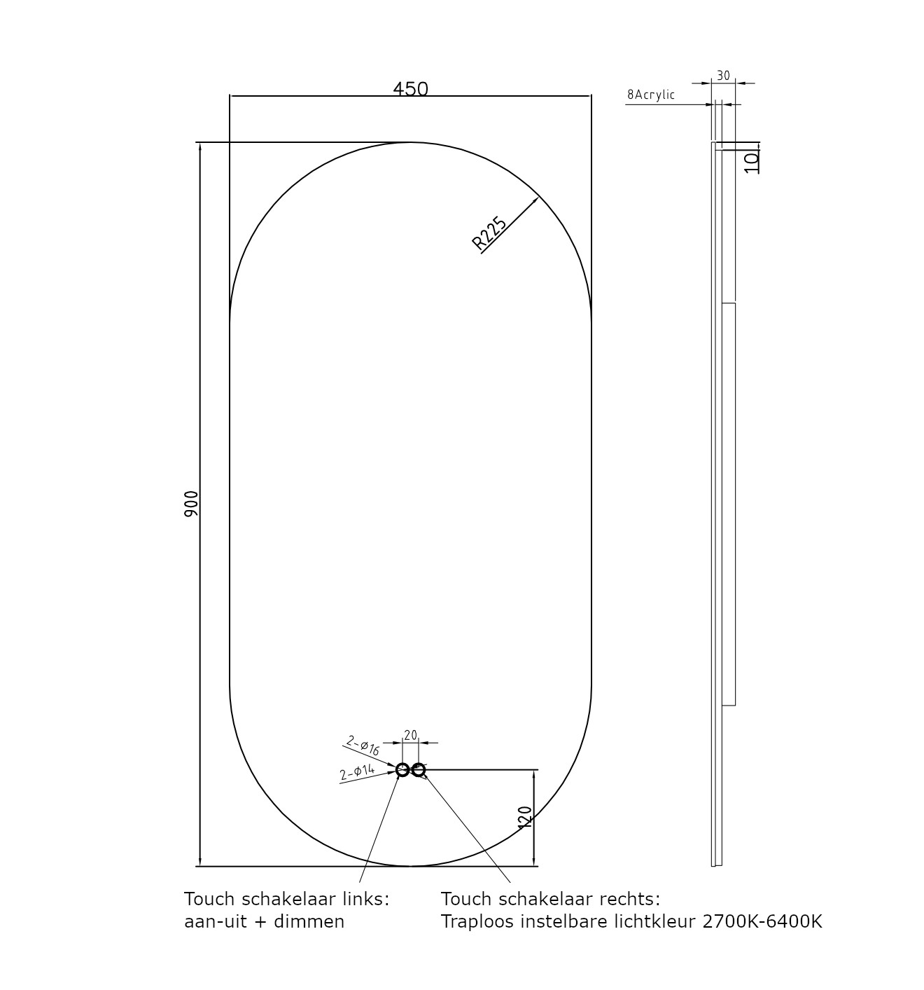 De verlichting is dimbaar middels een druk op de touch schakelaar, zodat de gewenste lichtsterkte naar eigen wens kan worden ingesteld. Met de rechter touch schakelaar kan de lichtkleur traploos worden ingesteld tussen warm wit (2700K) en koud wit (6500K), handig!