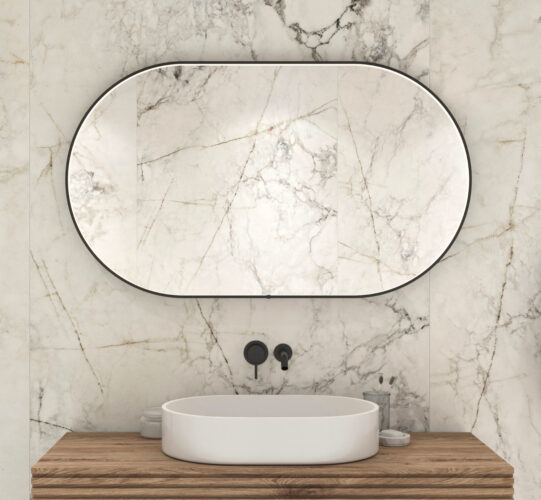 De LED verlichting is bij deze ovale spiegel rondom aan de binnenzijde van het mat zwarte frame geïntegreerd. Het unieke aan deze verlichting is dat de lichtbaan niet zichtbaar is als de verlichting uit is dankzij de ‘phantom’ oplossing. De verlichting geeft praktisch licht in het gezicht en zorgt daarmee voor een prima verlichting bij het scheren of make-uppen!