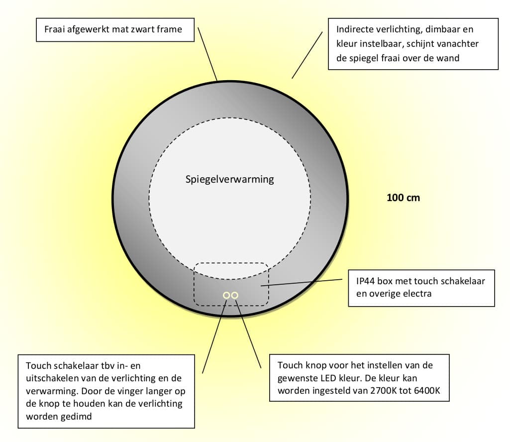 Deze trendy 100 cm ronde badkamer spiegel is van alle gemakken voorzien, zoals: ambient verlichting, spiegelverwarming, dimfunctie en instelbare lichtkleur