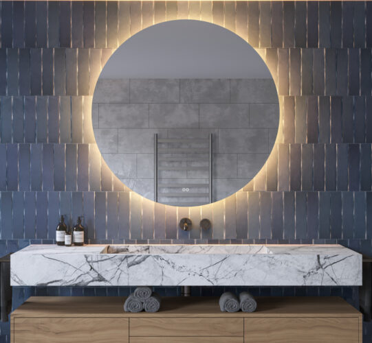 Verlichting Rondom voorzien van hi-power LED verlichting met instelbare lichtkleur tussen 2700K en 6400K, 24V, hoge lichtopbrengst. Schijnt vanachter de spiegel sfeervol over de wand.