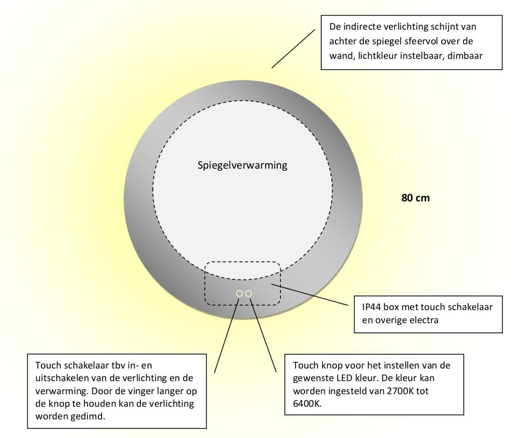 Deze 80 cm ronde badkamer spiegel is van alle gemakken voorzien, zoals, ambient verlichting, spiegelverwarming, dimfunctie en instelbare lichtkleur