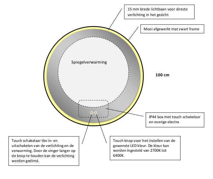 Deze 100 cm ronde badkamer spiegel is rondom voorzien van dimbare 24V LED verlichting en spiegelverwarming. Daarnaast is de LED spiegel voorzien van een dubbele touch schakelaar voor het instellen van de juiste lichtkleur en lichtsterkte. Zo creëert u zelf de gewenste sfeer in de badkamer!