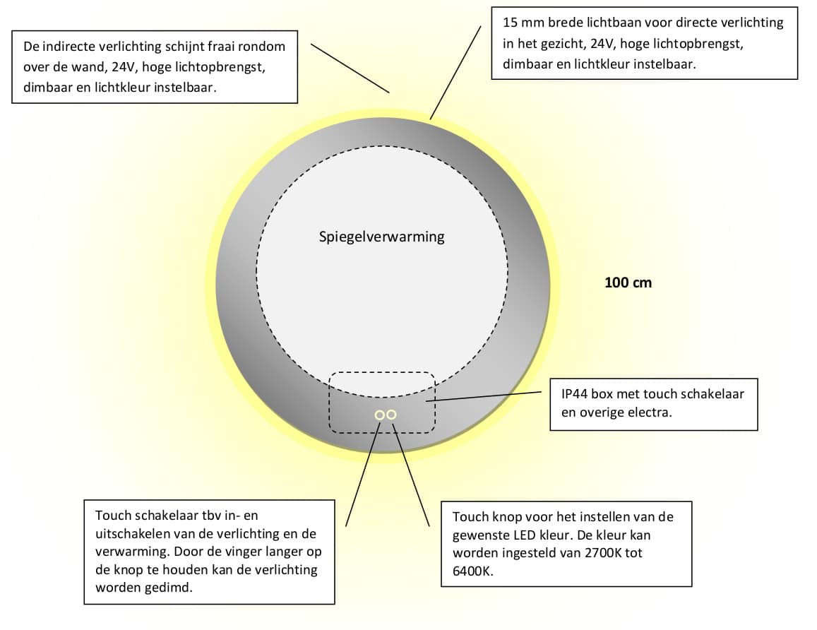 Ronde design spiegel met een diameter van 100 cm en van alle gemakken voorzien: dimbare verlichting, spiegelverwarming en instelbare lichtkleur