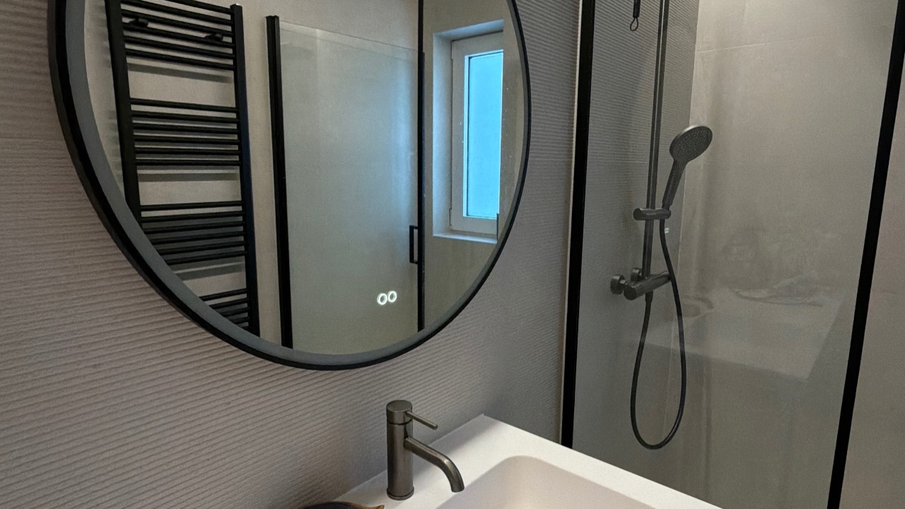De spiegel staat centraal in de badkamer en dat merk je. Mooi design, goede verlichting en beslaat niet.