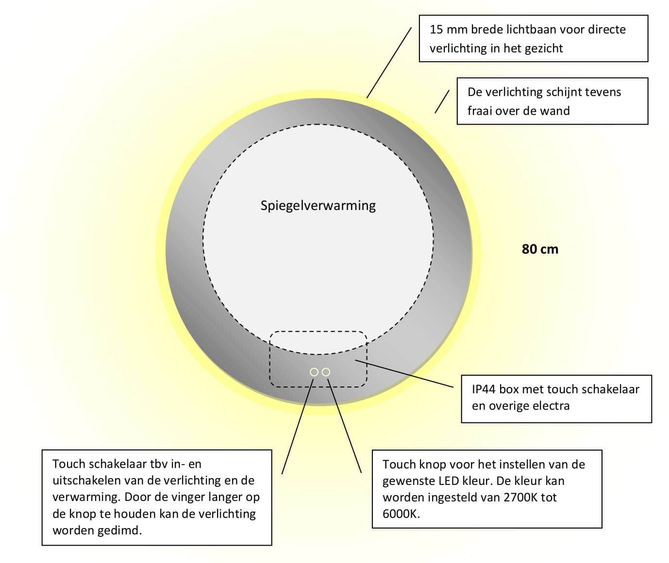 Wij zijn erg blij met deze mooi ronde spiegels met led verlichting (randloos). We hebben er twee van 80 cm naast elkaar hangen. Het staat erg luxe! De verwarming in de spiegel is heel prettig! En de verlichting is ideaal en schijnt goed op je gezicht. Een echte aanrader dus!